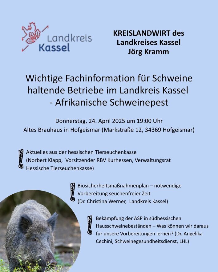 Afrikanische Schweinepest Regionalbauernverband Kurhessen e. V.Veröffentlicht von RBV in Tierhaltung · Dienstag 22 Apr 2025Tags: Schweinepest, ASP