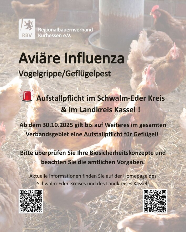 Auf der Homepage des Schwalm-Eder-Kreises bzw. des Landkreises Kassel finden Sie die jeweilige Allgemeinverfügung. Daraus ergibt sich eine bis auf Weiteres geltende Aufstallpflicht für alle Geflügelhalter in beiden Landkreisen.