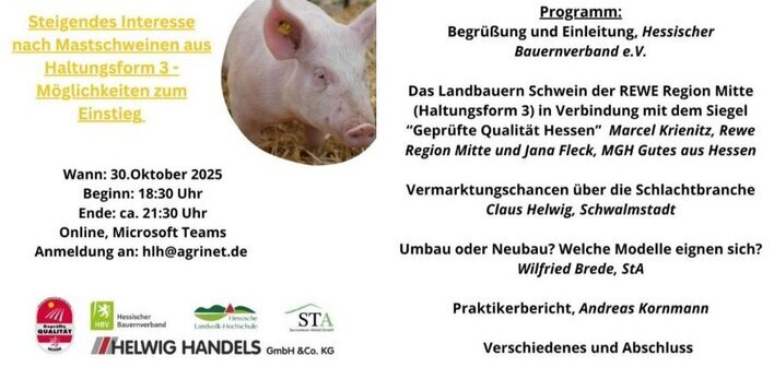 Am kommenden Donnerstag, 30.10.2025 bietet der Hessische Bauernverband e. V. eine Online-Veranstaltung zum Thema "Steigendes Interesse nach Mastschweinen aus Haltungsstufe 3 - Möglichkeiten zum Einstieg" ab 18:30 Uhr an. Anmeldungen können noch per Mail an hlh@agrinet.de gesendet werden. Der Vorsitzende des RBV Kurhessen Norbert Klapp eröffnet die Veranstaltung.
